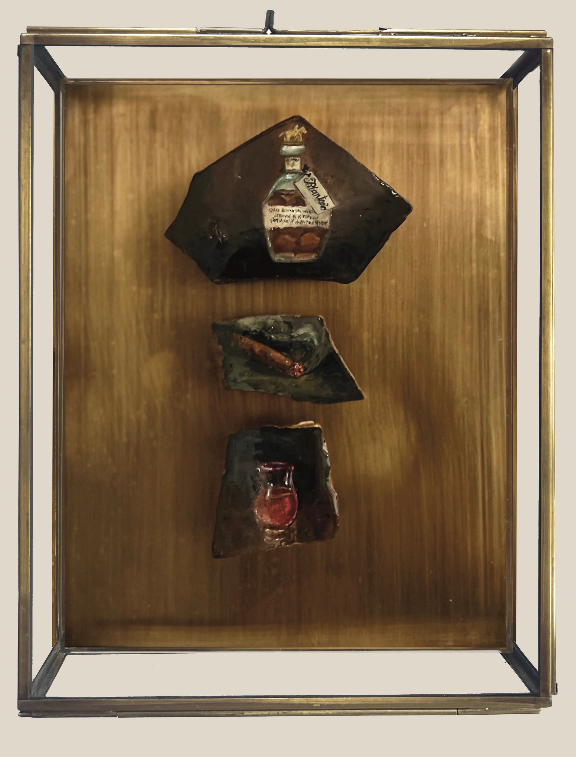 Miniature oil paintings on historical Mobile Bay pottery fragments housed in a 6x8x2 glass & brass shadowbox frame