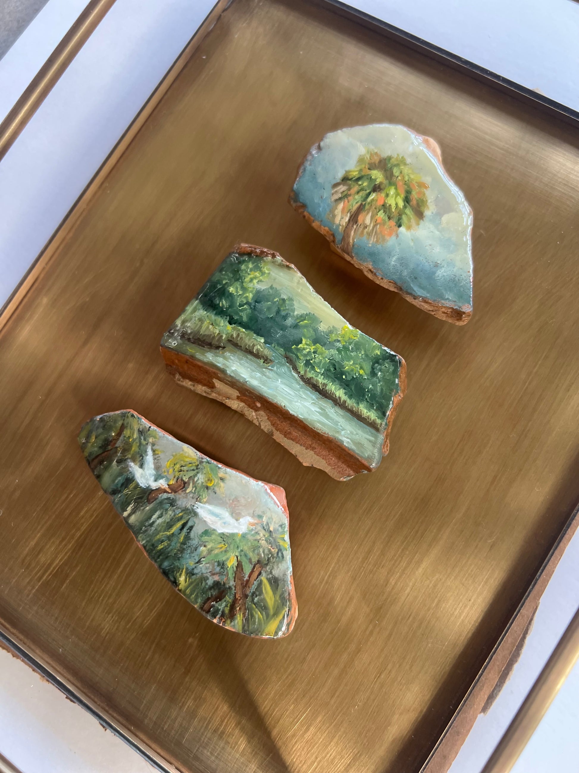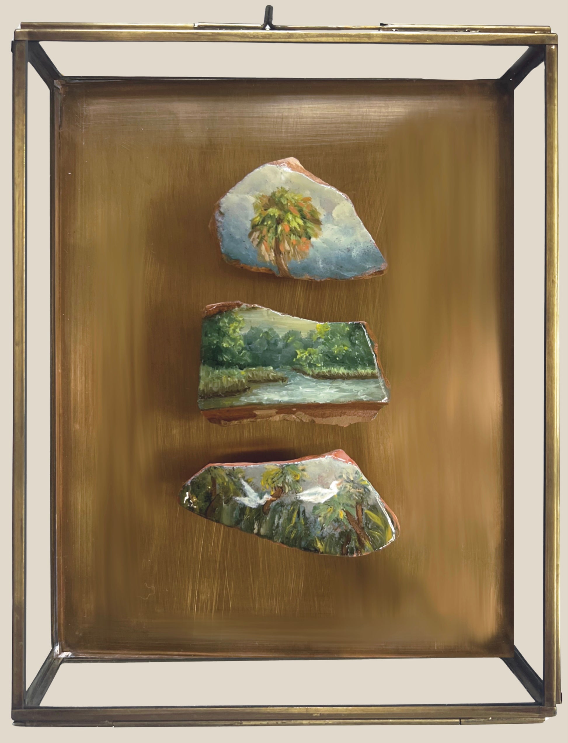 Each piece includes three miniature oil paintings on historic Mobile Bay pottery fragments, hand-collected along the Eastern Shore and displayed in brass and glass shadow box.