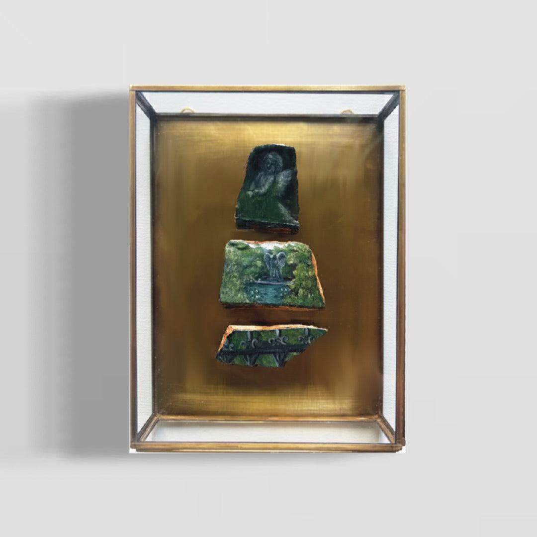 Three miniature oil paintings on historic Mobile Bay pottery fragments, hand-collected along the Eastern Shore and displayed in brass and glass shadow box. 6x8x2”