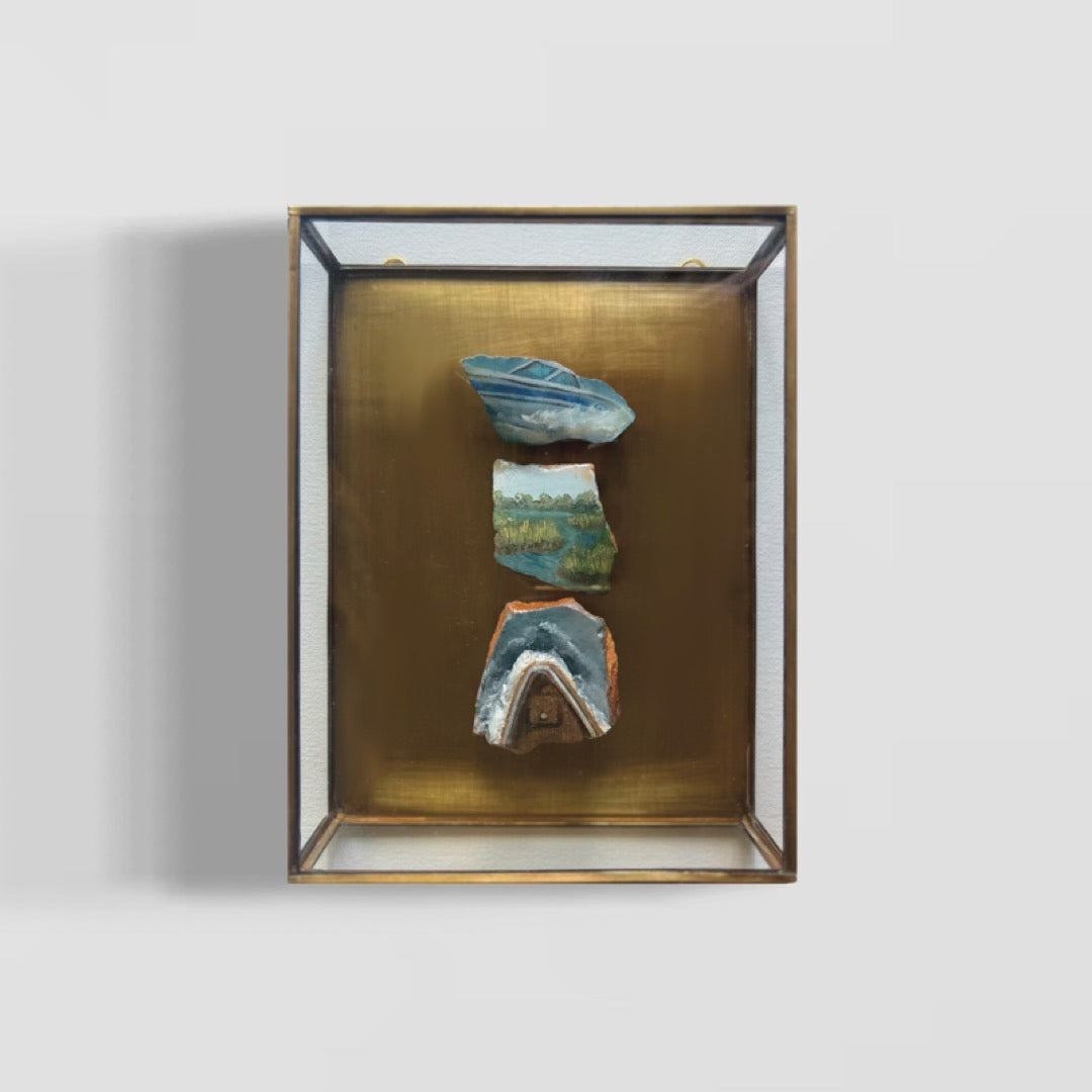 Three miniature oil paintings on historic Mobile Bay pottery fragments, hand-collected along the Eastern Shore and displayed in brass and glass shadow box. 6x8x2”