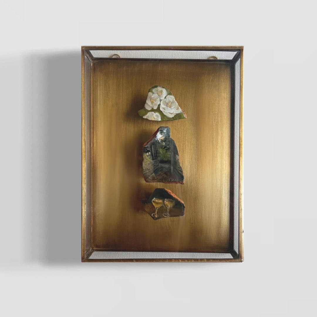 Three miniature oil paintings on historic Mobile Bay pottery fragments, hand-collected along the Eastern Shore and displayed in brass and glass shadow box. 6x8x2”
